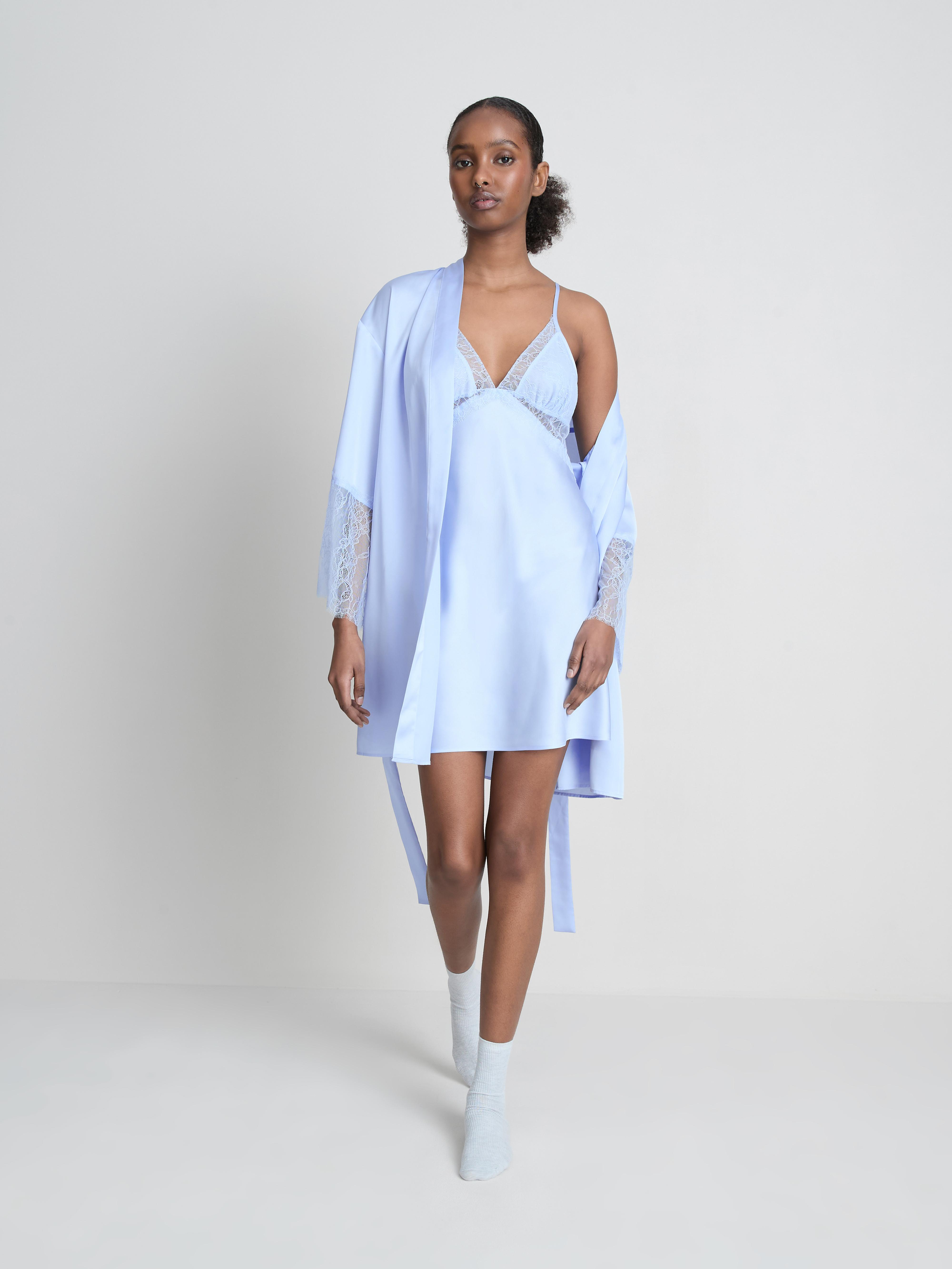 Light blue satin bridal chemise with lace trim, sheer details and adjustable straps