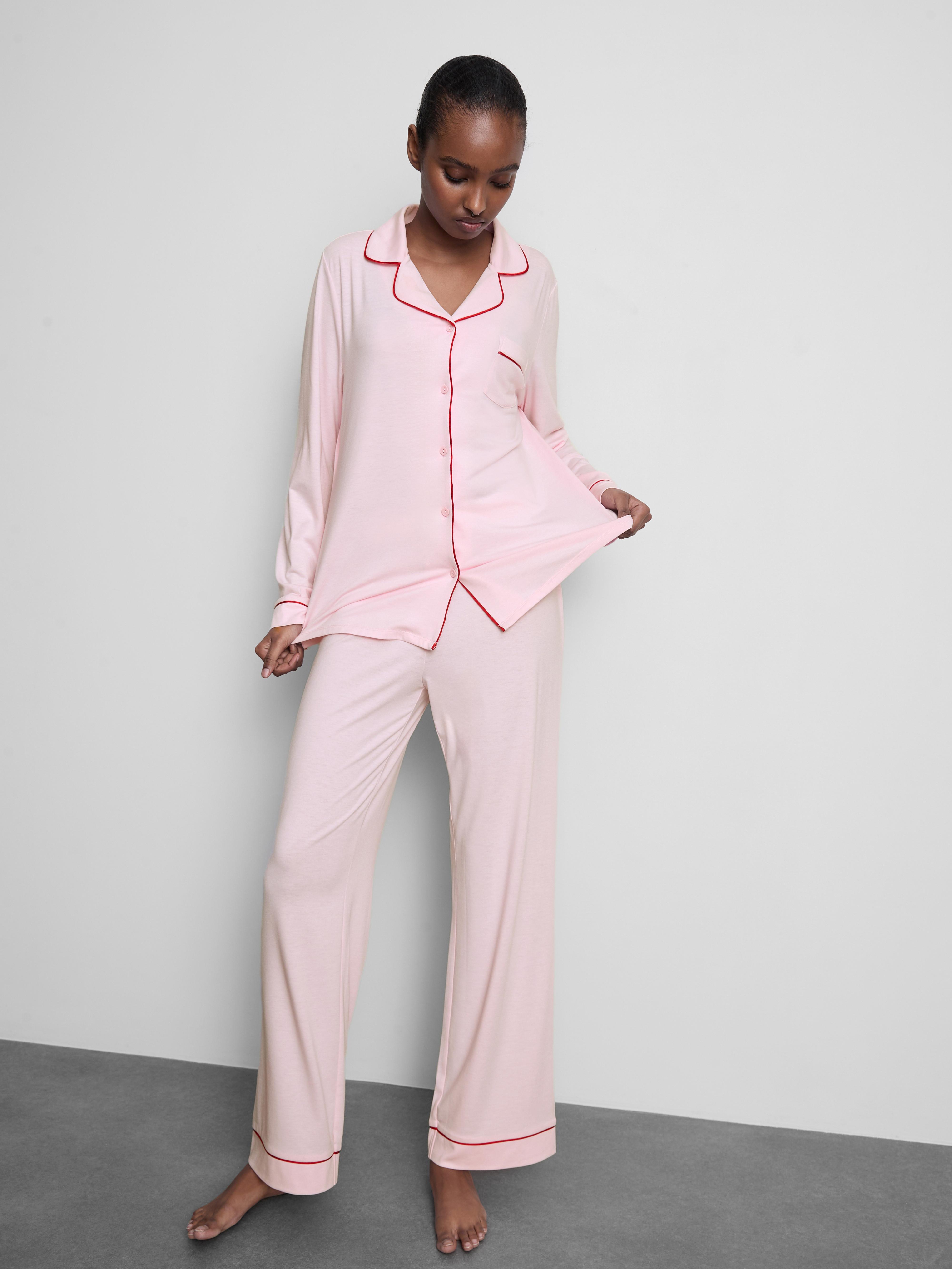 Light pink boyfriend pyjamas with contrast piping and soft jersey feel
