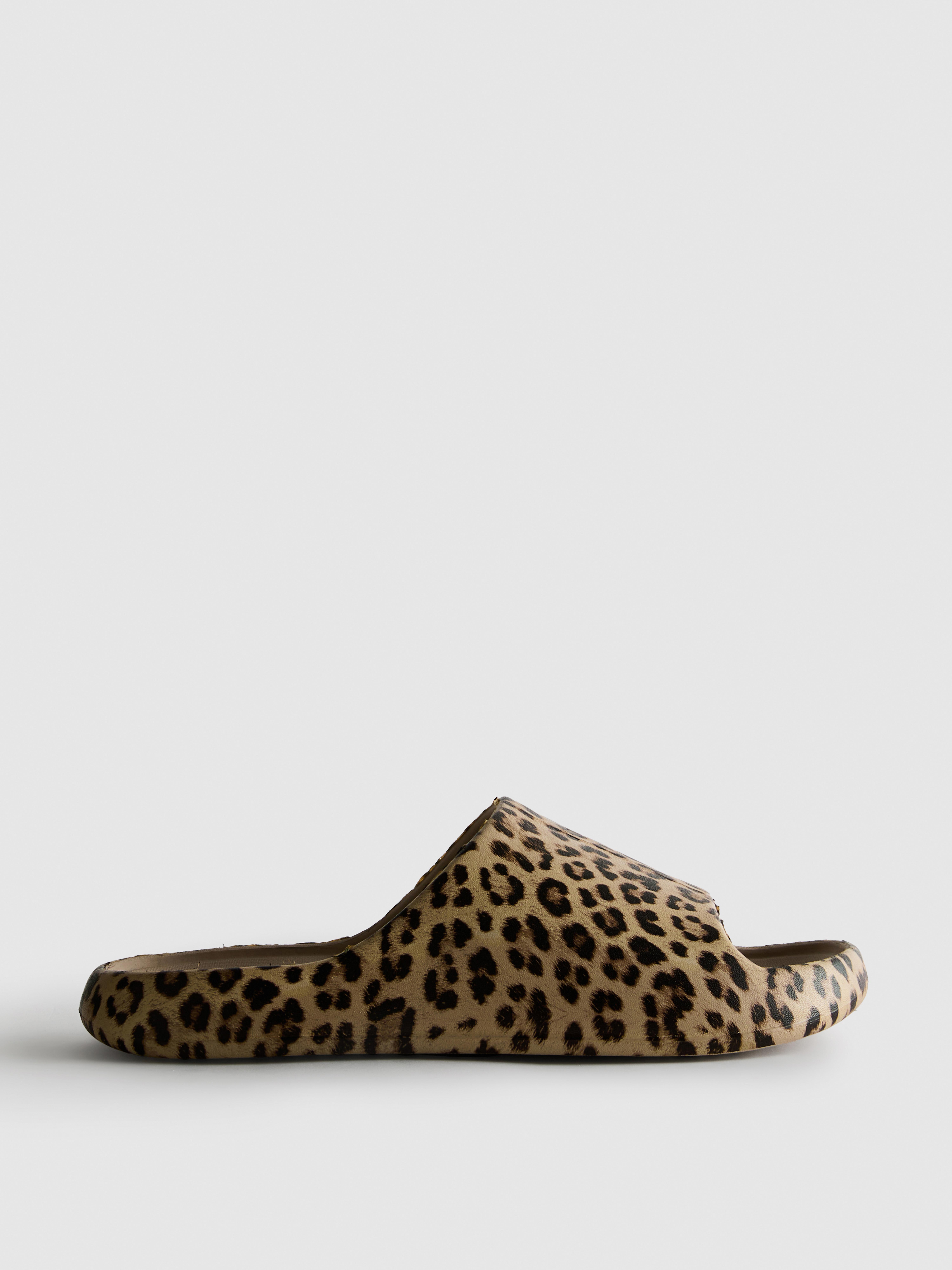 Easy, lightweight and ready for sunny days. These moulded pool sliders have a flexible and waterproof finish that feels light on your feet. The leopard print keeps things fun, while the one-piece, widestrap design offers a secure and durable fit. A contoured, ergonomic footbed supports the natural shape of the foot, teamed with a thick cushioned sole. Finished with an open-toe design to keep feet cool in warm weather.