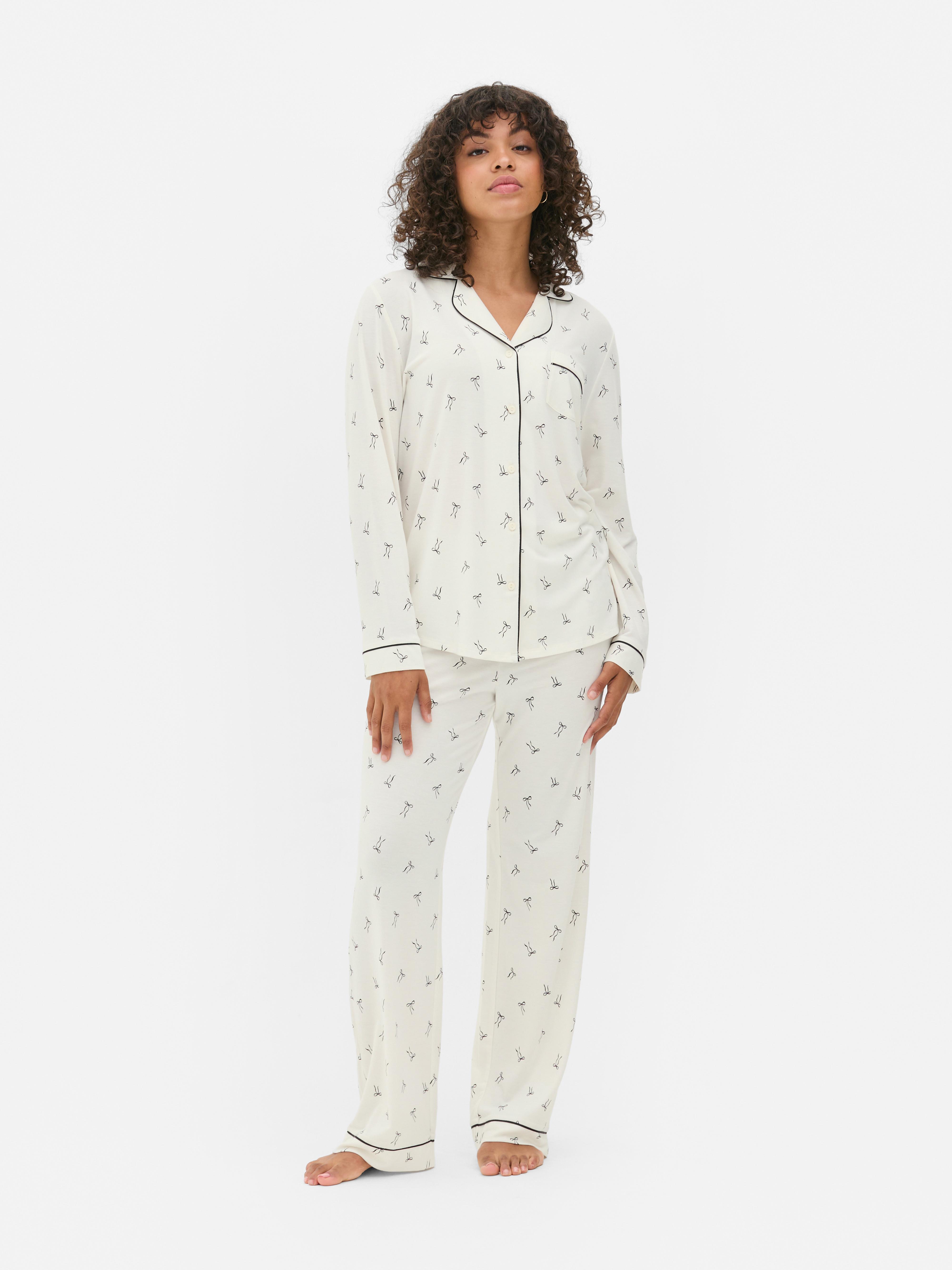 Get cosy in this printed jersey pyjama set, designed with a relaxed, comfy fit throughout. The long-sleeved button up shirt comes complete with a notched collar, chest pocket and contrast piping for that timeless sleepwear feel. The matching bottoms have an easy going silhouette with a full-length leg and piped hems to tie it all together. Made in soft jersey and finished with an all-over print, it’s the perfect set for winding down in style.