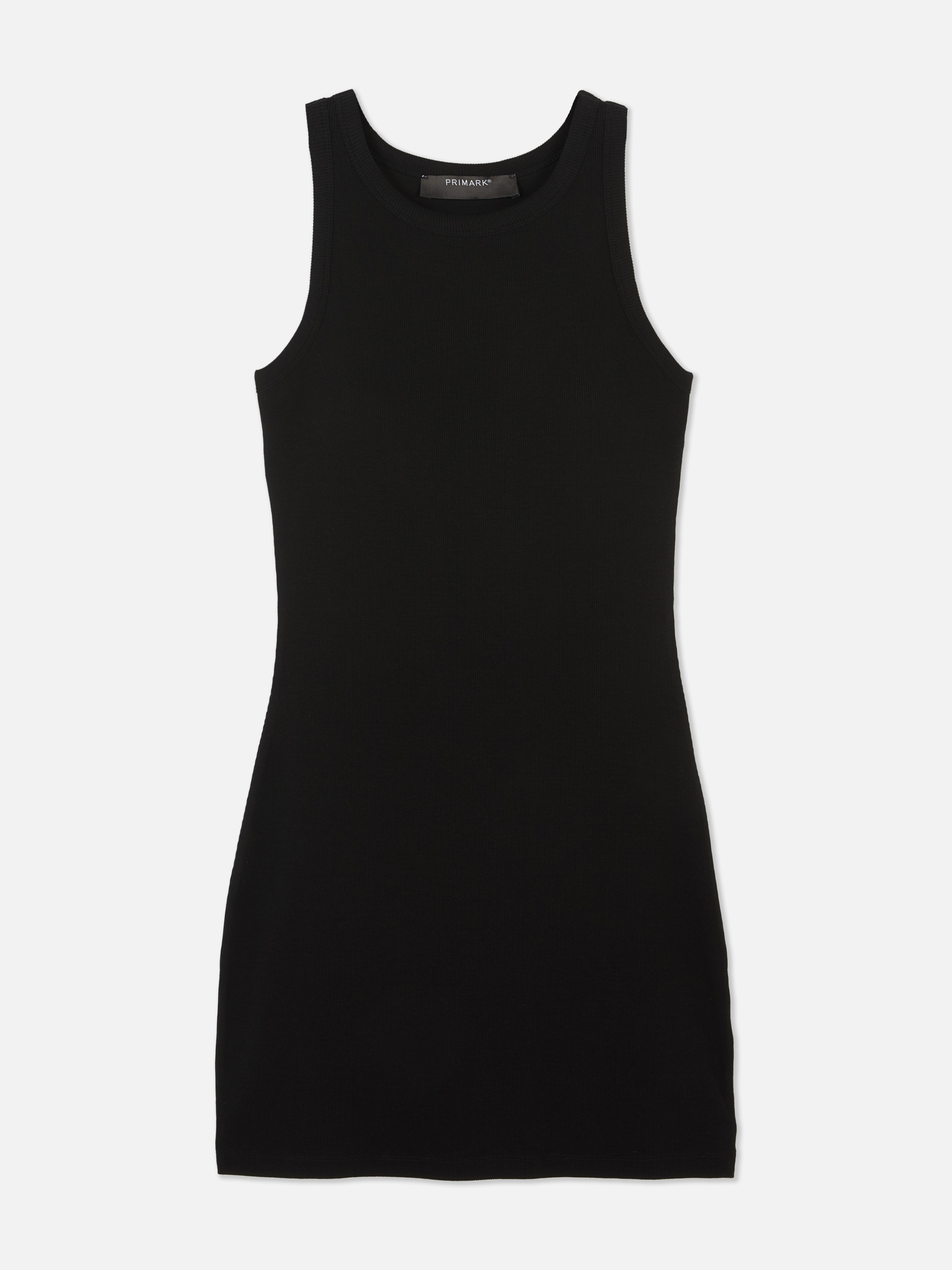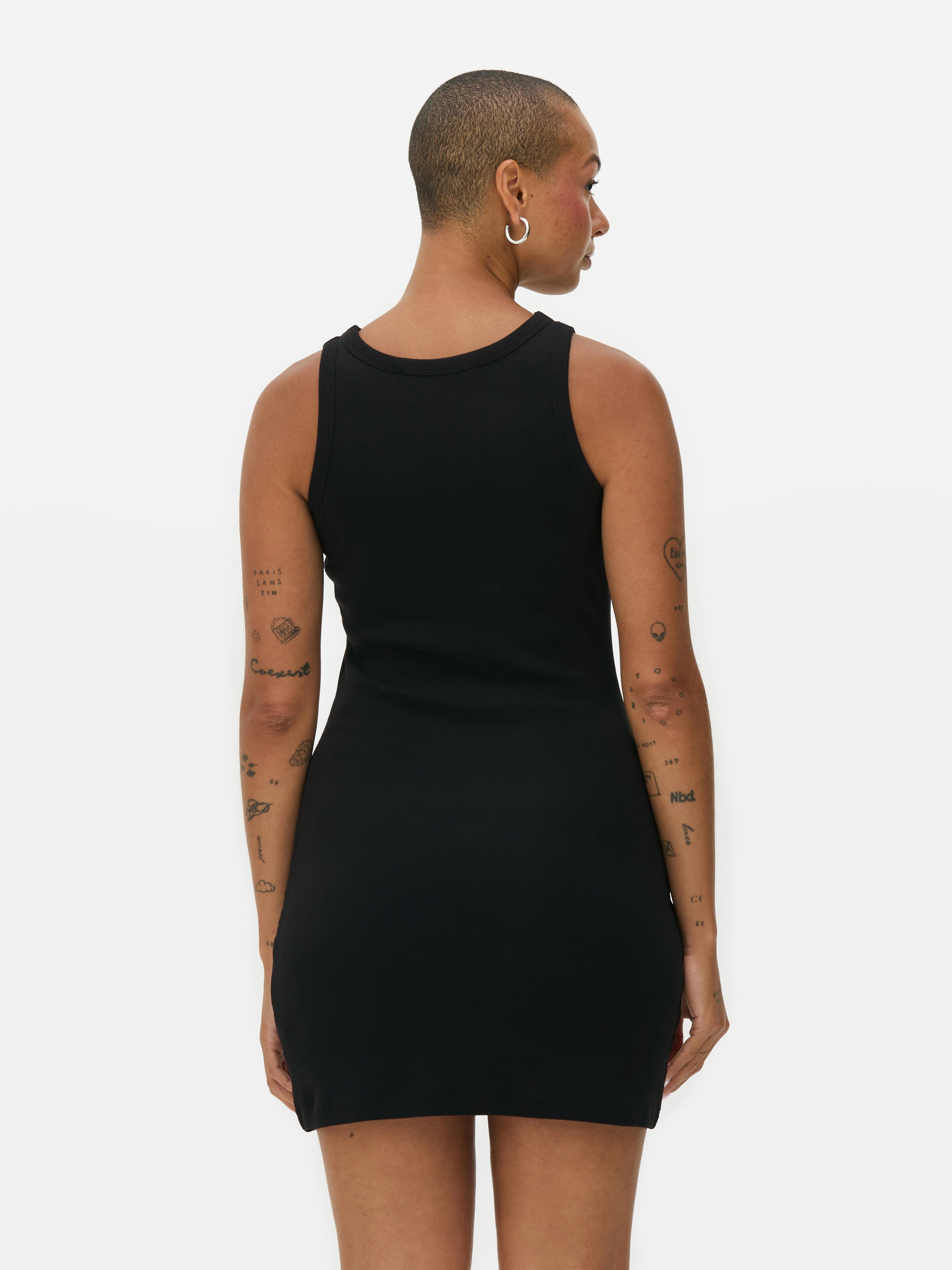 Keep it simple with this fitted mini dress in solid black. Made from a ribbed knit fabric, it comes in a sleeveless racerback style with a round neckline and body-hugging silhouette. The mini length makes it easy to pair with anything from chunky trainers to sandals, while the ribbed texture adds a touch of depth to this everyday go to. An across season essential that your wardrobe is ready for!