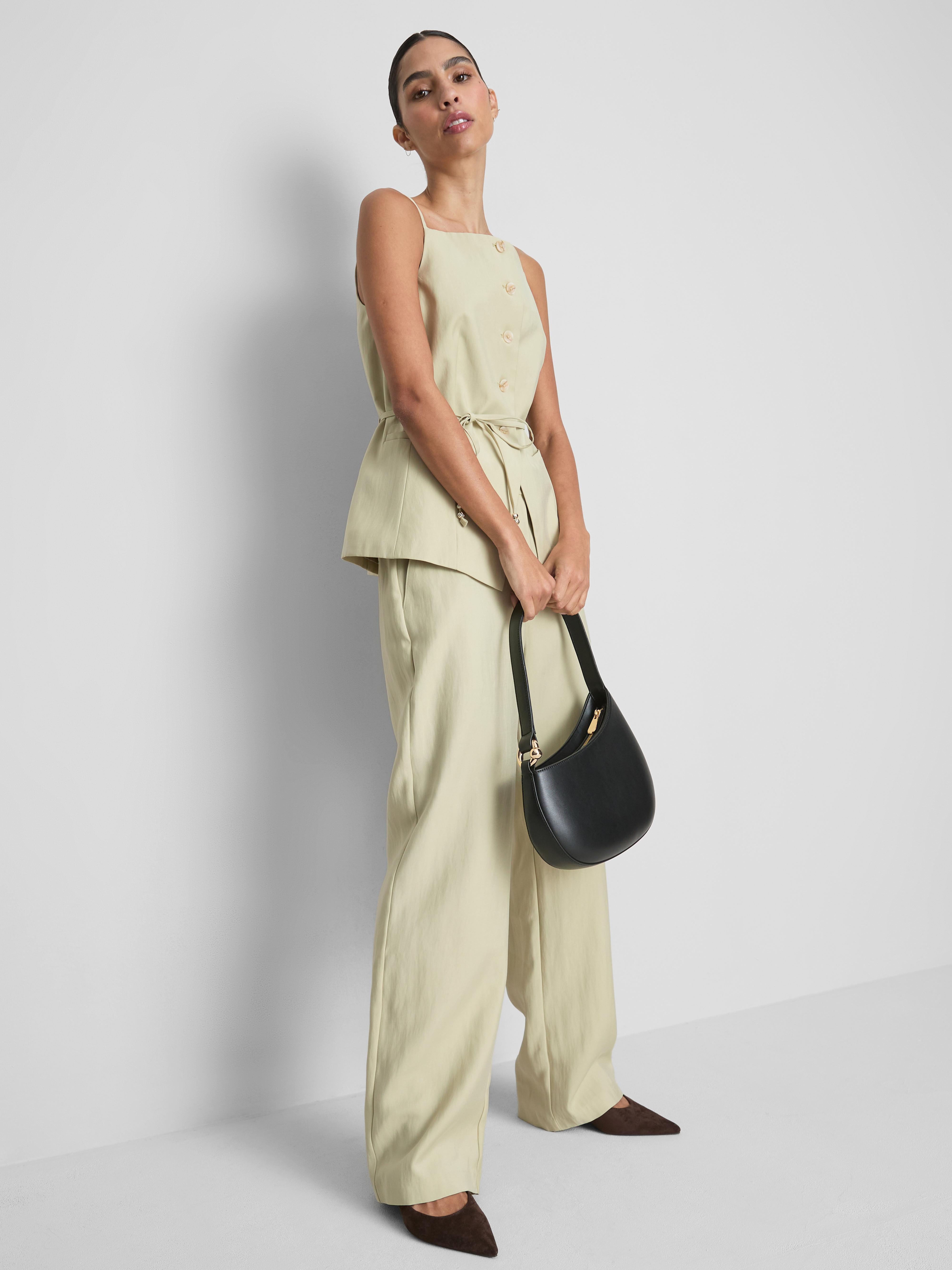 This By Coleen tailored waistcoat combines modern structure with elegant details. Designed in a soft green, it features a chic square high neckline, slim fixed shoulder straps and a full-button front. Tailored darts at the bust and waist shape the silhouette, while an adjustable tie-waist cord with delicate bead ends allows a personalised fit. Subtle faux welt pockets and a split hem at the front add style and practicality, making this high-neck waistcoat a sophisticated piece for layering or elevating your everyday outfits.